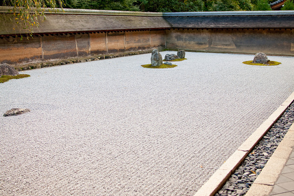 Vườn không có cây cối hoa lá chỉ có lớp sỏi trắng trãi rất đều, chung quanh thành bằng đất thấp. Trên mặt sỏi trắng đó sắp 15 hòn đá nhỏ.