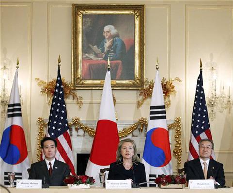 Bà Clinton và những người tương nhiệm tuyên bố điều này với các phóng viên trước cuộc họp tay ba. Bộ trưởng Ngoại giao Nhật Bản Seiji Maehara bày tỏ hy vọng là 3 nước sẽ làm việc để đạt được sự tham gia chắc chắn của Trung Quốc và Nga trong kế hoạch buộc Bắc Triều Tiên từ bỏ chương trình hạt nhân của họ.