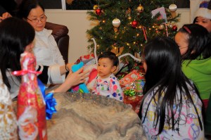 Các cháu nhỏ dưới mười tuổi đến cây Giáng sinh bức một bì thư đưa cho tôi xem va xướng lên tên người nào tới phiên nhận quà, mở quà, và làm gì, hát hay kể chuyện. Mọi người đều nôn nao hồi họp. : “ Ồ ! Ồ! dượng Mười”, Ồ Ố anh Chơn, Ồ ồ bà Me v..v…”