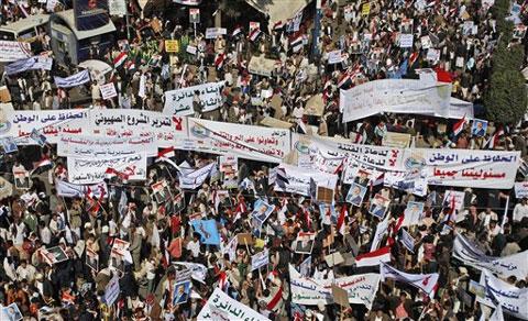 Biểu tình tại Yemen chống và ủng hộ chính phủ của Tổng thống Ali Abdullah sau khi ông Abdullah tuyên bố không tái tranh cử (ảnh tư liệu ngày 3 tháng 2, 2011)