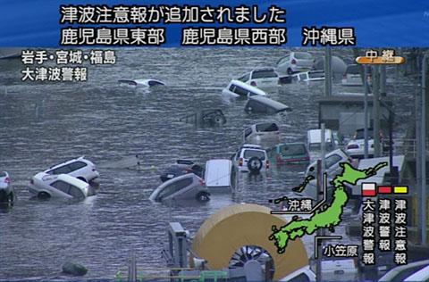 Ðài truyền hình nhà nước Nhật Bản NHK chiếu cảnh xe cộ bị nước lũ sau sóng thần ở Miyagi cuốn trôi, ngày 11 tháng 3, 2011