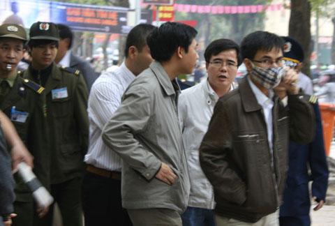 Luật sư Lê Quốc Quân (đeo kính) cùng với một số người khác đã bị nhân viên công lực đánh đập hôm 4/4/2011 tại khu vực gần Tòa án Nhân dân Hà Nội trong lúc tìm cách theo dõi phiên tòa xử ông Cù Huy Hà Vũ