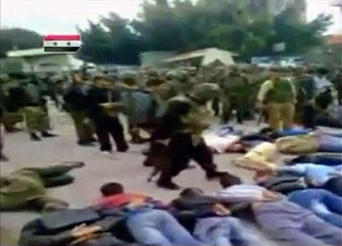 Hình ảnh từ video nghiệp dư cho thấy binh sĩ Syria di chuyển giữa những người đàn ông trong quần áo dân sự, bị trói tay sau lưng tại một địa điểm ở Daraa