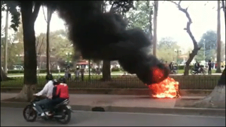 Hồi tháng Tư, một thanh niên đã đi xe máy tới vườn hoa đối diện Đại sứ quán Trung Quốc trên phố Hoàng Diệu, Hà Nội, tung băng rôn mang dòng chữ chống lệnh đánh bắt cá của Trung Quốc tại Biển Đông rồi châm lửa đốt chiếc xe máy của mình.