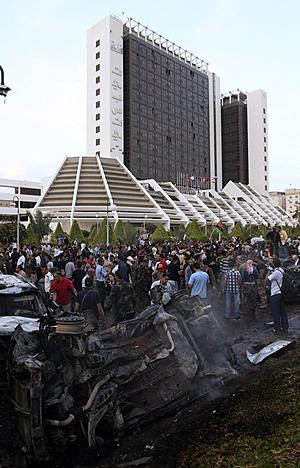 Dân chúng Libya vây quanh một chiếc xe bị phá hủy sau vụ nổ tại khách sạn Tibesti ở Benghazi, ngày 1/6/2011