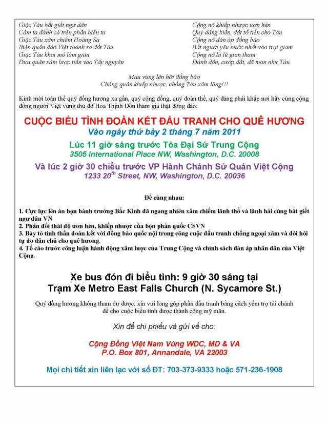 vào ngày Thứ Bảy, 2 tháng 7, 2011, trước tòa đại sứ Trung cộng và VP Hành chánh tòa Đại sứ Việt cộng..