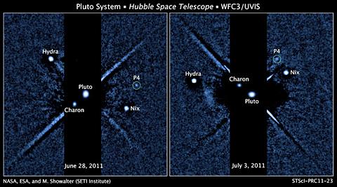 NASA nói Hubble hướng vào sao Diêm Vương vào ngày 28 tháng 6 vừa qua để tìm những vòng đai tương tự như vòng đai chung quanh sao Thổ thì máy thu hình của viễn vọng kính nhận ra được vệ tinh tí hon này.