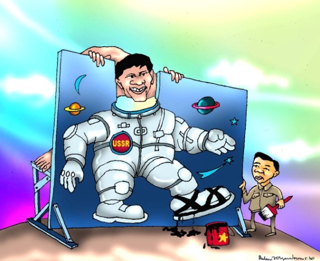 “Chuyến bay vào không gian lần thứ hai của Phạm Tuân được tổ chức không kém phần đình đám. Ðại diện tất cả các nuớc xã hội chủ nghĩa anh em đều đuợc mời đến chứng kiến. Chả may, có trục trặc kỹ thuật nên nên đã quá muời phút theo thời biểu mà phi thuyền vẫn cứ nằm im trên giàn phóng. Hốt hoảng, tất cả chuyên viên kỹ thuật cừ khôi nhất của khối cộng liền đuợc điều đến xem xét, tìm cách sửa chữa nhưng vô hiệu. Ngồi trên khán đài Lê Duẩn sốt ruột vẫy tay gọi Phạm Tuân lại gần, ghé tai nói nhỏ vài câu. Phạm Tuân chui trở vào vào phi thuyền. Không bao lâu, ông ta trở ra và buồn bã tuyên bố: