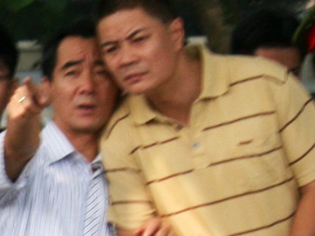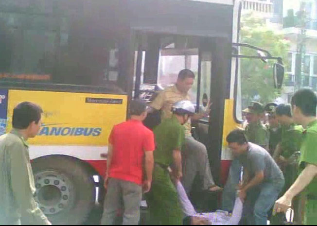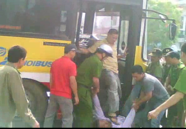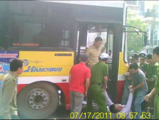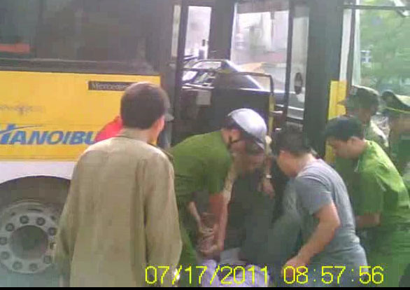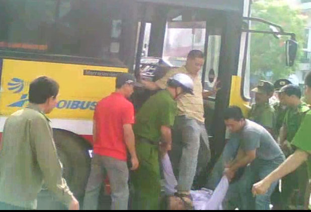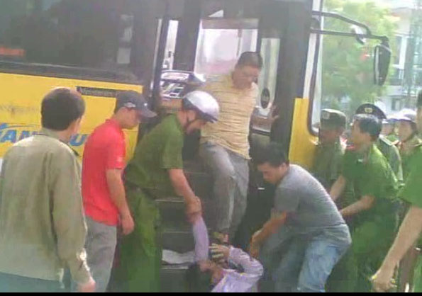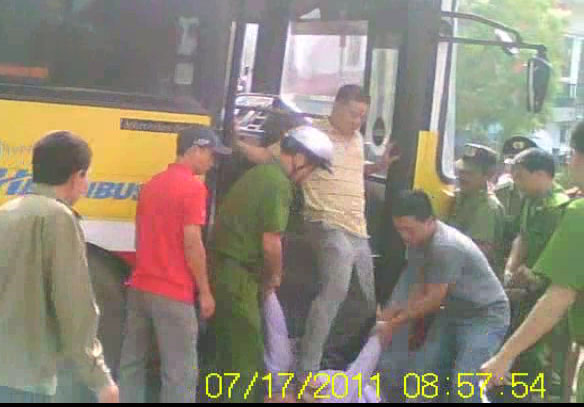 Người đàn ông trong đoàn bị bắt bị khiêng đến trước cửa chiếc xe bus đợi sẫn, viên An ninh chìm đầu đinh (áo vàng nhạt) từ trên xe bước xuống vài bước