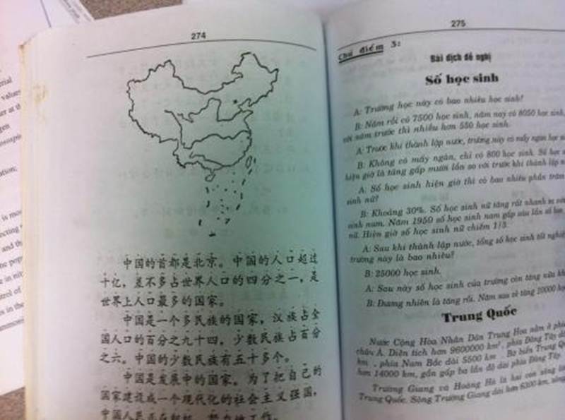 1. Theo thông tin phản ánh trên mạng, cuốn sách dạy tiếng Trung với tựa đề “Luyện kỹ năng đọc hiểu Tiếng Hoa” do Ngọc Huyên biên soạn, được Nhà xuất bản Thanh niên ấn hành, ở trang 274 có in hình bản đồ Trung Quốc với đường lưỡi bò liếm gần hết cả biển Đông.