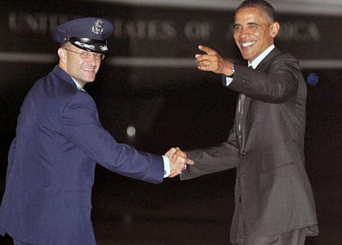 Tổng thống Obama (phải) cùng với Ðại tá Rizer quay lại để nghe giới truyền thông và phi hành đoàn hát bài chúc mừng sinh nhật ‘Happy Birthday’ khi ông đến Chicago