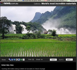 Trang tin News.com.au (một bộ phận thuộc tập đoàn News Corp. của ông trùm Rupert Murdoch) vừa đăng loạt ảnh về những ngọn thác kỳ vĩ nhất thế giới. Ở phần thác Bản Giốc, News.com.au ghi chú: Detian Falls, China (Thác Đức Thiên, Trung Quốc).