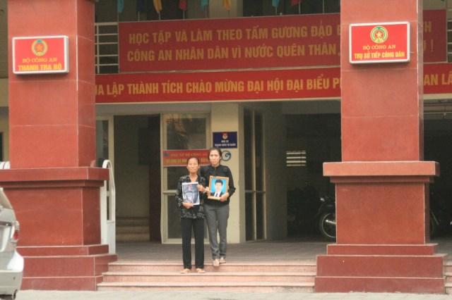 Chị Tuyền và mẹ của anh Nhựt trước Bộ công an để nộp đơn.
