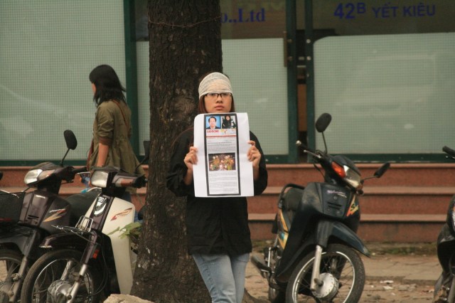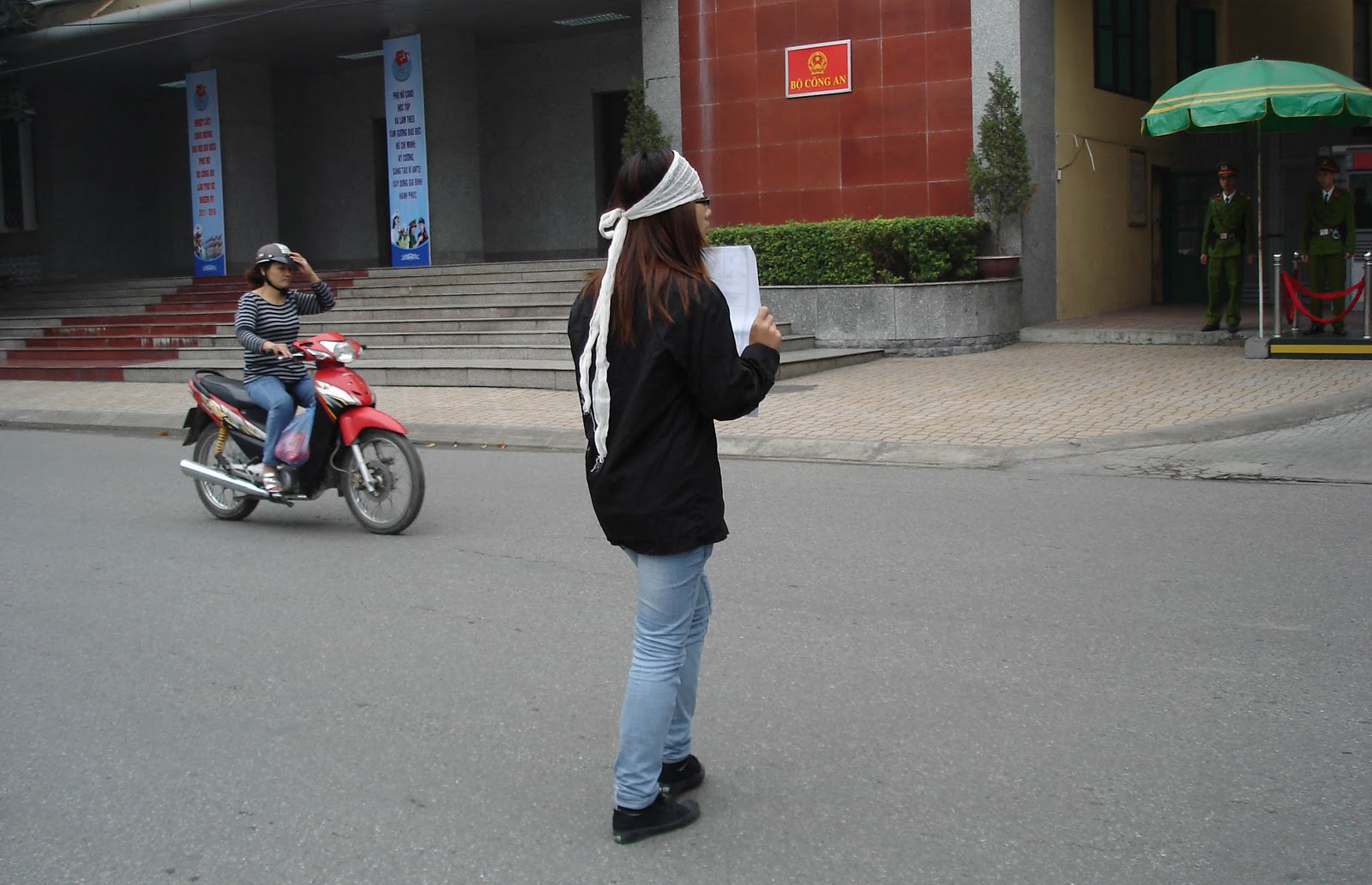 Cô đã đến trước cổng Bộ Công an để giơ cao tấm ảnh của bố và bài báo đã đưa thông tin về phiên tòa trên tờ Người Lao Động..