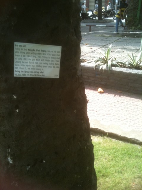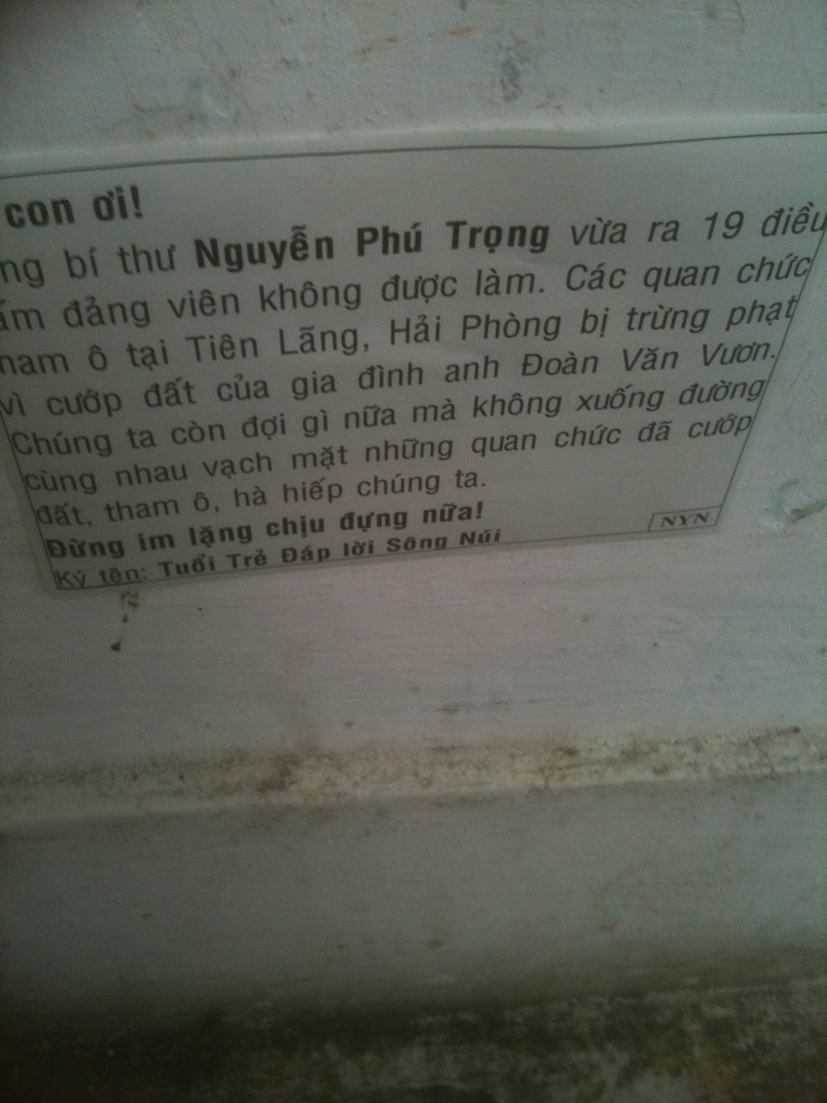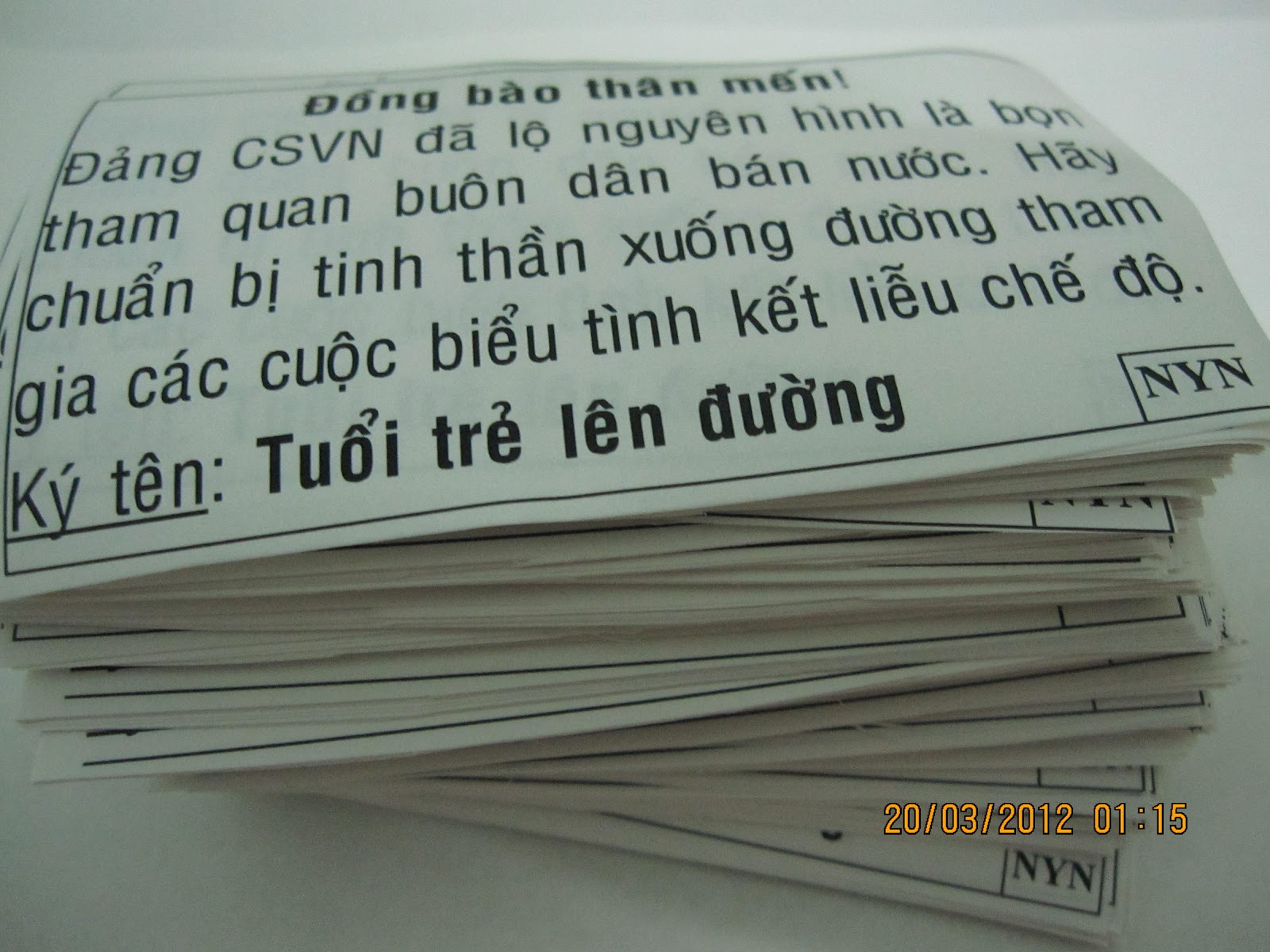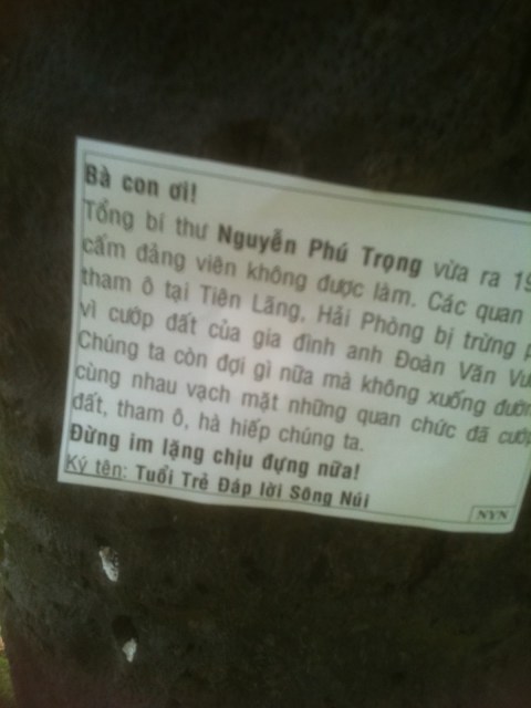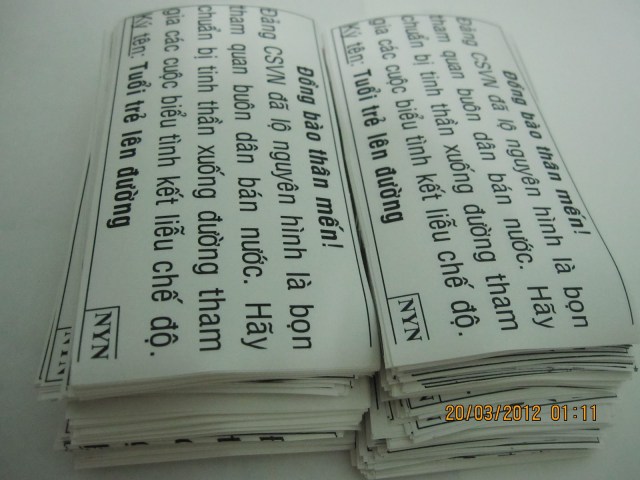 Hôm nay, thứ Bẩy 24-03-2012 người ta đã thấy xuất hiện tại vài nơi khác nhau trong thành phố Saigon, những tờ truyền đơn được ký tên bởi TUỔI TRẺ ĐÁP LỜI SÔNG NÚI với nội dung kêu gọi bà con hãy đứng dậy noi gương Đoàn văn Vươn.