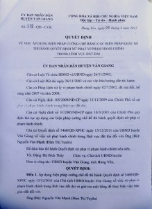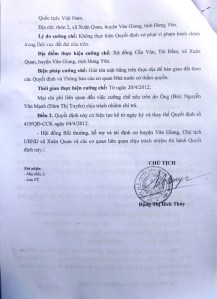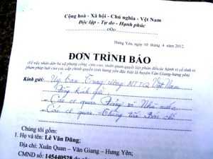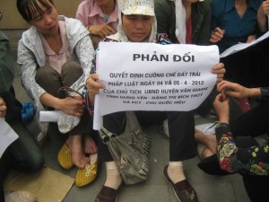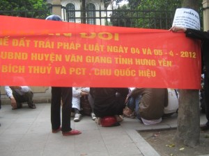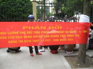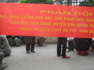 Lúc 9h tại số 46 Trang Thi, trụ sở tiếp dân của MTTQVN có hơn 100 nông dân với rất nhiều biểu ngữ trên tay. Chủ yếu là bà con nông dân Văn Giang bị cưỡng chế thu hồi đất trong dự án ECOPARK. Bà con Văn Giang ra khiếu nại việc Chủ tịch UBND huyện Văn Giang Đặng Thị Bích Thủy ra quyết định số 578 ngày 5-4-2012 về việc áp dụng biện pháp cưỡng chế bằng biện pháp khác. Hình thức cưỡng chế giải tỏa mặt bằng thực địa. Trong khi đó bà con vẫn đang khiếu nại về quá trình thu hồi đất.
