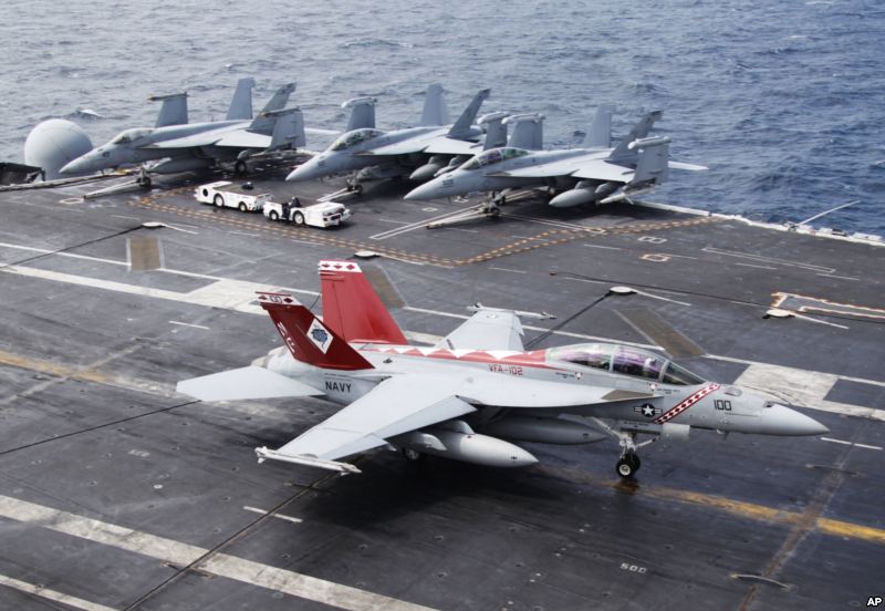 Ðuôi của một chiếc phản lực cơ chiến đấu F-18 của hải quân Hoa Kỳ được tóm bởi một sợi dây cáp trên boong chiếc tầu George Washington trong vùng hải phận quốc tế, nằm cách khu biên giới trên biển đang có tranh chấp giữa hai nước Triều Tiên khoảng 200 kilomet về phía nam.