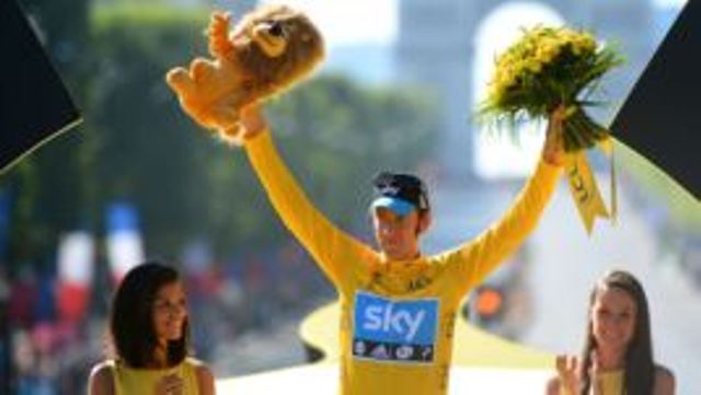 Bradley Wiggins năm nay 32 tuổi, đã 3 lần đoạt huy chương vàng Olympic, mặc chiếc áo vàng của tay đua dẫn đầu, giơ cao 2 tay mừng chiến thắng, khi cán qua mức đến vào thủ đô Paris, dọc theo đại lộ Champs Elysees.