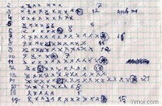 “Đó là nhật ký ‘làm việc’ của một cô gái mại dâm gần như kín các dấu ‘X’. Sở dĩ phải ghi chép là để cuối tháng, cuối tuần, cuối ngày ‘đọ sổ’ với chủ mà thanh toán tiền, giống hệt với một dạng ‘chấm công’. Đây là một đoạn trong bài viết: ‘Những ký hiệu dấu sao ‘*’ trong vòng tròn, đó là ‘đi qua đêm’ và được tính bằng 3 ‘cuốc’ đi nhanh. ..Dấu ‘X’ có gạch dưới là những lần đi một lần, tính với chủ là 1, nhưng em cho khách làm 2, được bo khá. Còn cái dấu ‘X’ nằm trong ô vuông thì em không nói gì cả, nhất định không chịu nói ra. Như vậy, đây là một dạng ‘văn vật’ có hồn. Có ngày em đánh dấu 16 ‘nhát’, nói chung số ngày có trên 10 ‘nhát’ hơi nhiều. Ngày nhiều nhất là có tới đánh 21 cái dấu X’, lại có 3 gạch chân’. Nhưng 21 lần/ngày vẫn chưa phải là kỷ lục. Cũng chính cô gái này kể lại: Ở Đồ Sơn có đứa dịp 30/4, đã ‘đi khách’ tính với chủ là 50 lần.”
