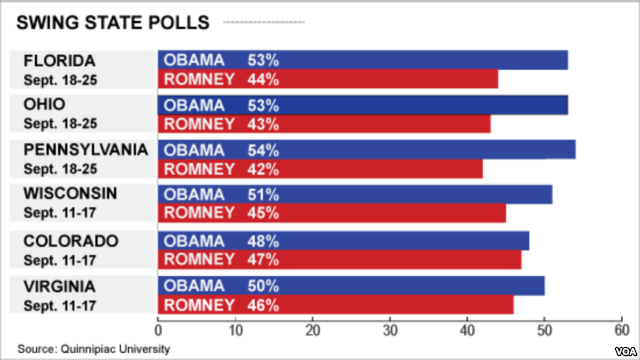 Một cuộc thăm dò ý kiến công chúng mới cho biết, Tổng thống Hoa Kỳ Barack Obama đã mở rộng khoảng cách dẫn trước ứng cử viên đối thủ Đảng Cộng Hòa Mitt Romney tại tiểu bang miền nam Florida và tiểu bang miền trung tây Ohio – hai trong số các tiểu bang trận địa quan trọng của cuộc bầu cử tổng thống năm nay.