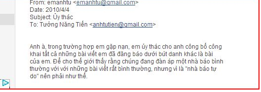 “Anh à, trong trường hợp em gặp nạn, em ủy thác cho anh công bố công khai tất cả những bài viết em đã đăng báo dưới bút danh khác là bài của em. Để cho thế giới thấy rằng chúng đang đàn áp một nhà báo bình thường với với những bài viết rất bình thường, nhưng vì là ‘nhà báo tự do’ nên phải như thế.”