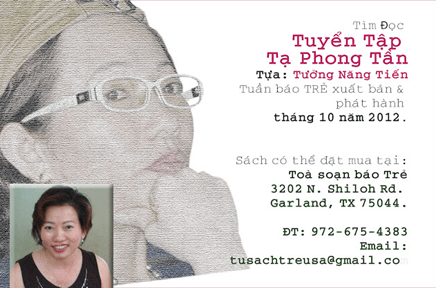Thể theo ý nguyện này, tôi đã liên lạc và được ban biên tập tuần báo Trẻ đồng ý phụ trách xuất bản Tuyển Tập Tạ Phong Tần (*). Đây là một cuốn sách mỏng chỉ bao gồm một số những bài viết về thời sự của tác giả trong hai năm 2010 và 2011 nhưng thể hiện được đầy đủ những nỗ lực – cũng như quan niệm – của em tôi về vai trò của một blogger: “Dùng quyền công dân của mình đòi hỏi công chức Nhà nước phải thực hiện đúng chức năng, nhiệm vụ, quyền hạn mà luật pháp quy định.”