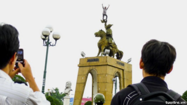 Ông Phạm Văn Bình, 43 tuổi, làm nghề đạp xích lô, đã trèo lên tượng đài danh tướng Trần Nguyên Hãn ở khu trung tâm TP HCM gần chợ Bến Thành.