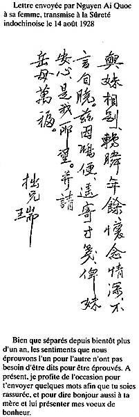 Thứ hai, hiện nay có một bức thư của ông Hồ – Lý Thụy gửi bà Tăng Tuyết Minh, đã bị mật thám Pháp tại Đông Dương chặn được và giữ lại ngày 14 tháng 8 năm 1928, hiện được lưu trữ tại CAOM (viết tắt của Centre des Archives d’Outre-Mer – Trung tâm Lưu trữ Hải ngoại) đặt tại Aix-en-Provence (Daniel Hémery, HO CHI MINH De L’Indochine au Vietnam, Gallimard, Paris 1990, tr.145.) Khi ở Thái Lan ông Hồ đã viết bức thư này có nội dung như sau: