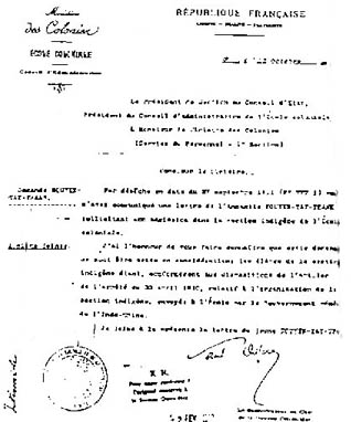 Hiện nay, để nuôi thân, tôi đang làm việc cho công ty Chargeurs Réunis (Tàu Amiral Latouche – Tréville). Tôi hoàn toàn không còn nguồn lực nào và rất thiết tha muốn có học vấn. Tôi muốn trở nên có ích cho nước Pháp trong quan hệ với đồng bào tôi và đồng thời mong muốn đồng bào tôi thu lợi được từ học hành.