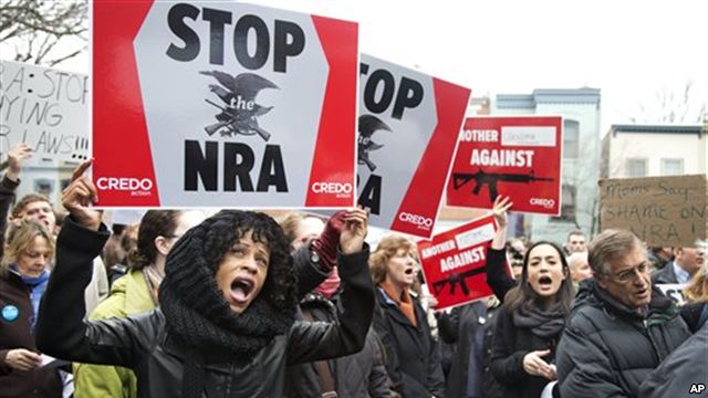 Hôm thứ hai, một đám đông nhỏ đã tuần hành trước văn phòng ở thủ đô Washington của Hiệp hội Súng Quốc gia, một tổ chức có thế lực luôn mạnh mẽ phản đối các luật lệ kiểm soát súng đạn chặt chẽ hơn. Những người tuần hành hy vọng bi kịch mới đây ở Connecticut có đủ sức mạnh để thôi thúc người Mỹ phải có hành động. Một người phát biểu: