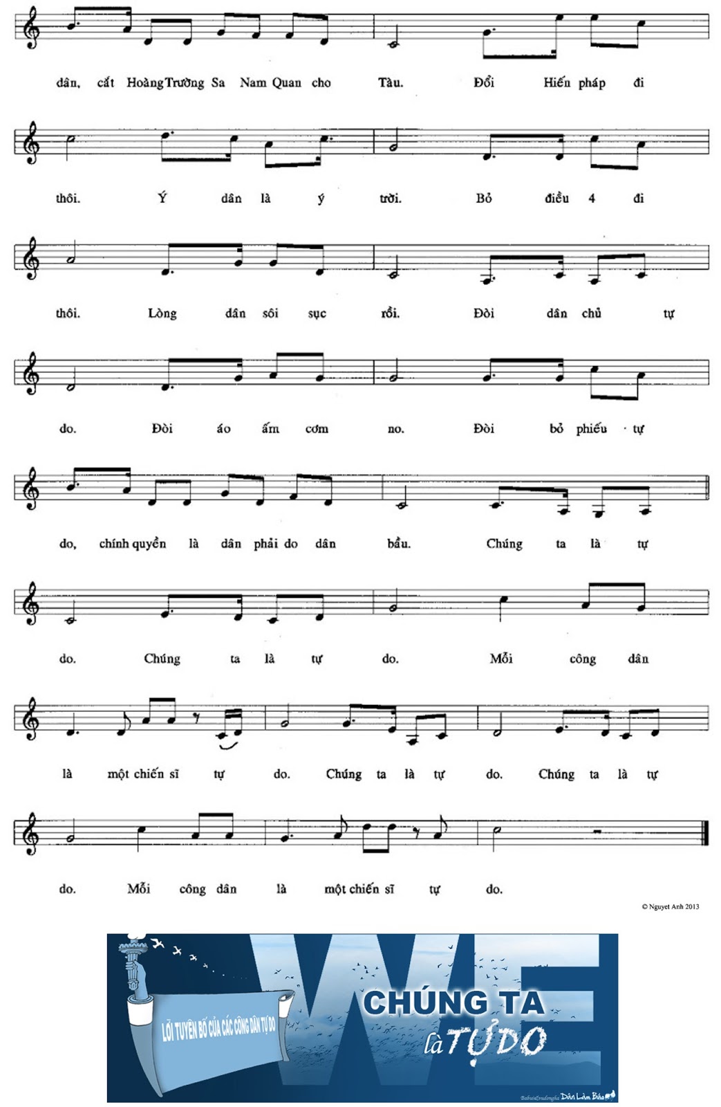 Danlambao – Ca sỹ Nguyệt Ánh, người đã ký tên vào Lời Tuyên Bố của các Công Dân Tự Do (ở vị trí 705) vừa gửi đến Danlambao một sáng tác mới, ca khúc “Chúng ta là Tự Do” được thể hiện qua giọng hát của chính tác giả.