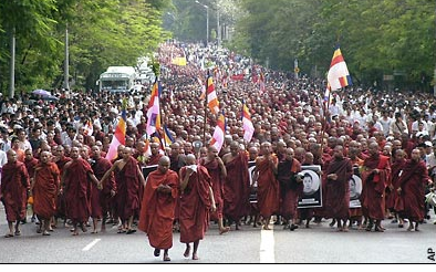 Sư sãi cùng dân chúng Xứ Chùa Vàng xuốn đường. Ảnh AP.