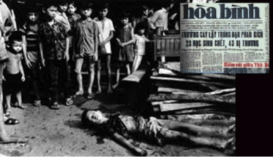 “Dangling from the trees and poles in the village square were the village chief, his wife, and their twelve children, the males, including a baby, with their genitals cut off and stuffed into their mouths, the females with their breasts cut off”. The Vietcong had ordered everyone in the village to witness the execution. They started with the baby and then slowly worked their way up to the elder children, to the wife, and finally to the chief himself… It was done very coolly, as much an act of war as firing anti-aircraft gun. ” It was routine… Because it became routine to us, we did not report it over and over again”. (Trích trong cuốn “The Real War” của cựu tổng thống R. Nixon trang 39-40.)