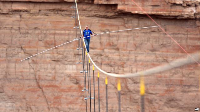 Anh Wallenda đã băng qua vực Grand Canyon hôm qua mà không có dây an toàn hay lưới an toàn trong khi gió quất quanh anh và khiến dây cáp bị lắc.