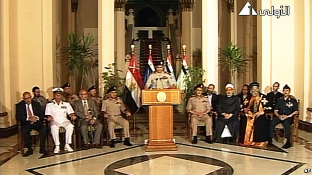 Trong một bài phát biểu truyền hình tối thứ tư, chỉ huy trưởng Quân đội Abdul Khalil Al-Sisi tuyên bố hiến pháp Ai Cập đã bị đình chỉ và người đứng đầu tòa án Bảo hiến đã được bổ nhiệm làm nguyên thủ quôc gia lâm thời.