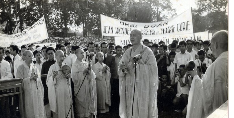 Sau lưng vị cao tăng là biểu ngữ của học sinh hai trường trung học dậy theo chương trình Pháp nổi tiếng tại Sài gòn: trường nam sinh Jean Jacques Rousseau (nay là trường Lê Quí Đôn) và trường nữ Marie Curie.