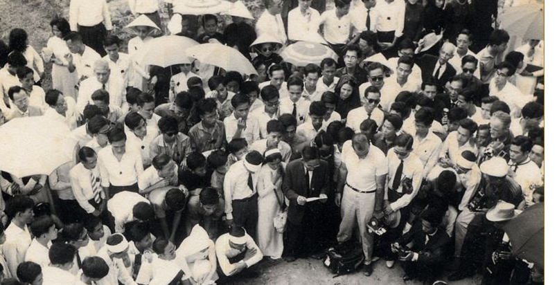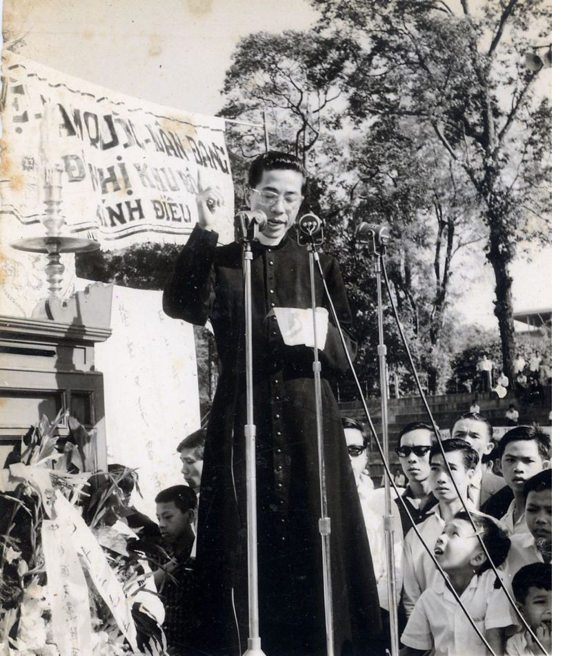 Linh Mục Thanh Lãng đại diện Trung Tâm Văn Bút Việt Nam đọc diễn văn. Sau lưng linh mục là biểu ngữ của Việt Nam Quốc Dân Đảng Đệ Nhị Khu.