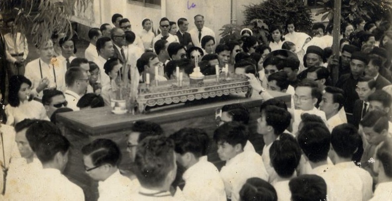 Ảnh chụp sinh viên các trường đại học tại Sài Gòn đã không sợ công an, mật vụ, tự động khiêng quan tài Nhất Linh từ trong nhà xác bệnh viện Grall ra trước sân để chuẩn bị di quan.