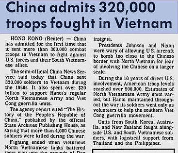 Ngoài ra còn có bằng chứng sau đây cho thấy sự xuất hiện của quân Trung cộng trực tiếp tham chiến tại Việt Nam. Trên tờ nhật báo tại Hongkong đăng theo Reuter (tờ báo uy tín) có viết về sự xuất hiện của 320.000 quân Trung cộng tại Việt Nam chiến đấu cho chủ nghĩa cộng sản: