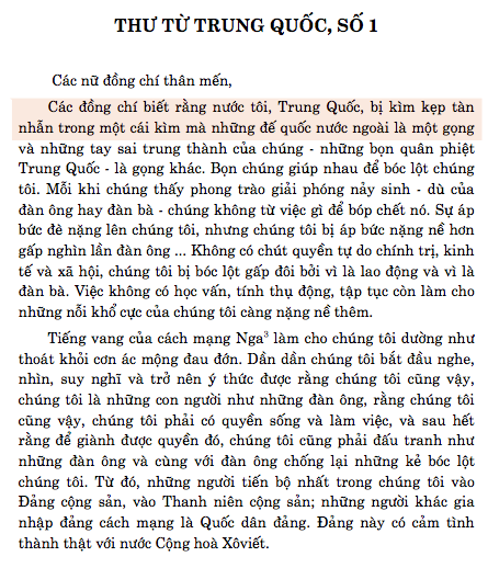 Các đồng chí biết rằng nước tôi, Trung Quốc bị kìm kẹp tàn nhẫn trong một cái kìm mà những đế quốc nước ngoài là một gọng và những tay sai trung thành của chúng – những bọn quân phiệt Trung quốc – là gọng khác…”