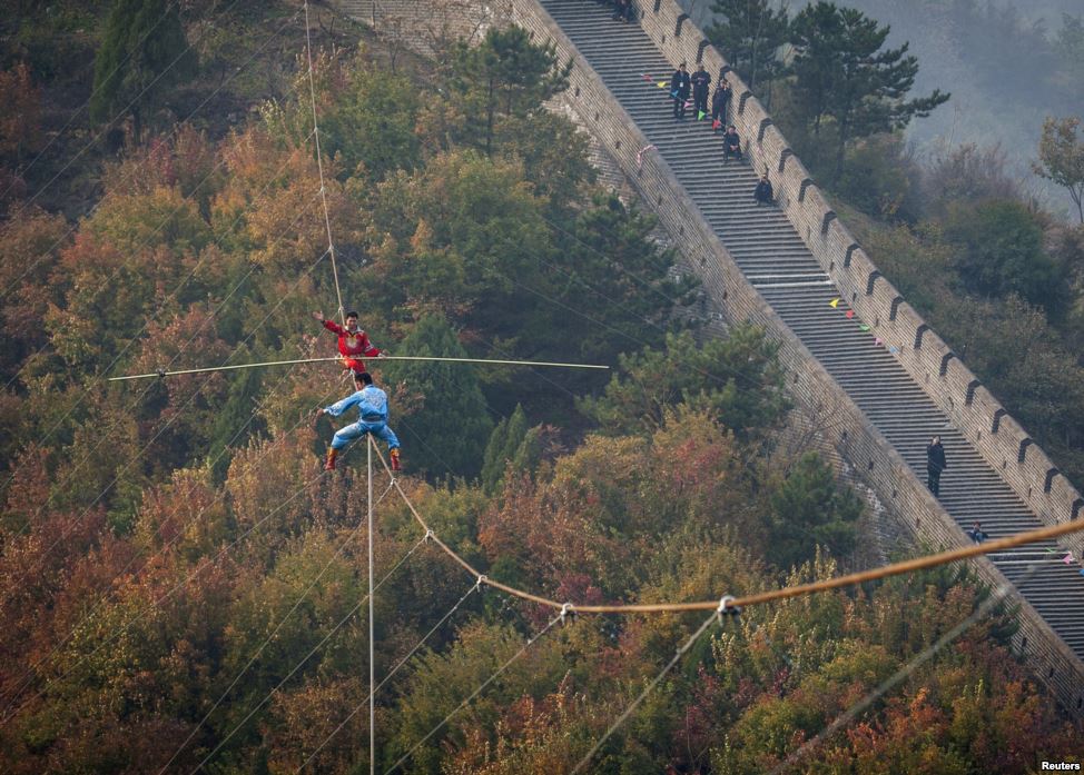 9 Adili Wuxor (đồ đỏ), được mệnh danh là “Hoàng tử đi dây” cùng ‘đệ tử’ biểu diễn thăng bằng trên Vạn Lý Trường Thành ở Thiên Tân, Trung Quốc.