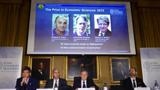 Người lớn tuổi nhất trong số 3 vị tân khôi nguyên, giáo sư Eugene Fama, được coi là cha đẻ của khoa học tài chính hiện đại và học thuyết thị trường hiệu quả (efficient market hypothesis). Công trình được trao giải năm nay được ông khai sinh từ những năm 60 của thế kỷ trước, và nó bắt nguồn từ một thất bại cá nhân. Từng tham gia mua bán cổ phiếu, và không mấy thành công, Fama dựa trên học thuyết chính thống của kinh tế học là học thuyết về kỳ vọng hợp lý (rational expectation), để mô hình hóa sự biến động của giá chứng khoán.