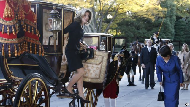 Bà Kennedy, 55 tuổi, tươi cười và vẫy tay chào đám đông từ trong một chiếc xe ngựa cổ hơn một thế kỷ đến Hoàng Cung để trình ủy nhiệm thư lên Hoàng đế Akihito.