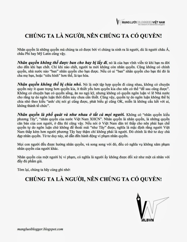 Trong tài liệu ngắn phân phát cho người dân, Mạng Lưới Blogger Việt Nam cũng nêu rõ: “Ngày 07/11/2013, Việt Nam đã tham gia ký kết Công ước chống Tra tấn tại trụ sở chính của LHQ ở thành phố New York (Mỹ). Việt Nam dự kiến phê chuẩn Công ước này vào năm 2014. Tuy nhiên, cho đến nay, Việt Nam chưa có luật nào định nghĩa rõ ràng những hành động nào là tra tấn.