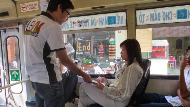 Các blogger cũng phát tài liệu cả trên xe buýt, trong nhà sách, đặc biệt Nhà sách Ponagar còn nhận 10 bộ tài liệu để phát cho khách hàng. Nhiều bạn trẻ hưởng ứng rất vui vẻ.