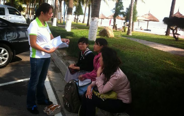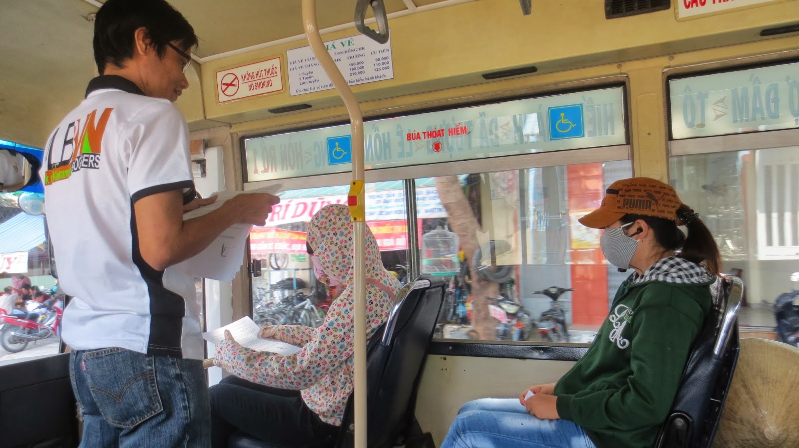 Các blogger cũng phát tài liệu cả trên xe buýt, trong nhà sách, đặc biệt Nhà sách Ponagar còn nhận 10 bộ tài liệu để phát cho khách hàng. Nhiều bạn trẻ hưởng ứng rất vui vẻ.