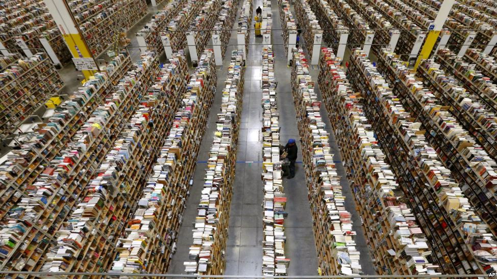 Một nhân viên Amazon.com xếp hàng hóa theo từng dảy dài hàng cây số tại trung tâm thực hiện đơn đặt hàng của Amazon.com vào ngày thứ Hai gọi là “Cyber Monday”, ngày mua sắm trực tuyến bận rộn nhất trong dịp lễ ở Phoenix, bang Arizona, Mỹ, ngày 2 tháng 12, 2013.