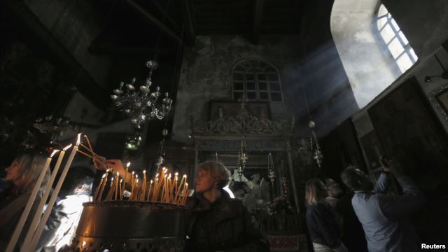 Không khí trang trọng hơn ở phía bên trong Nhà thờ Giáng Sinh, một ngôi thánh đường cổ, khi hàng ngàn người hành hương đang xếp hàng để viếng hang đá, nơi mà theo truyền thuyết Chúa Giêsu đã ra đời.
