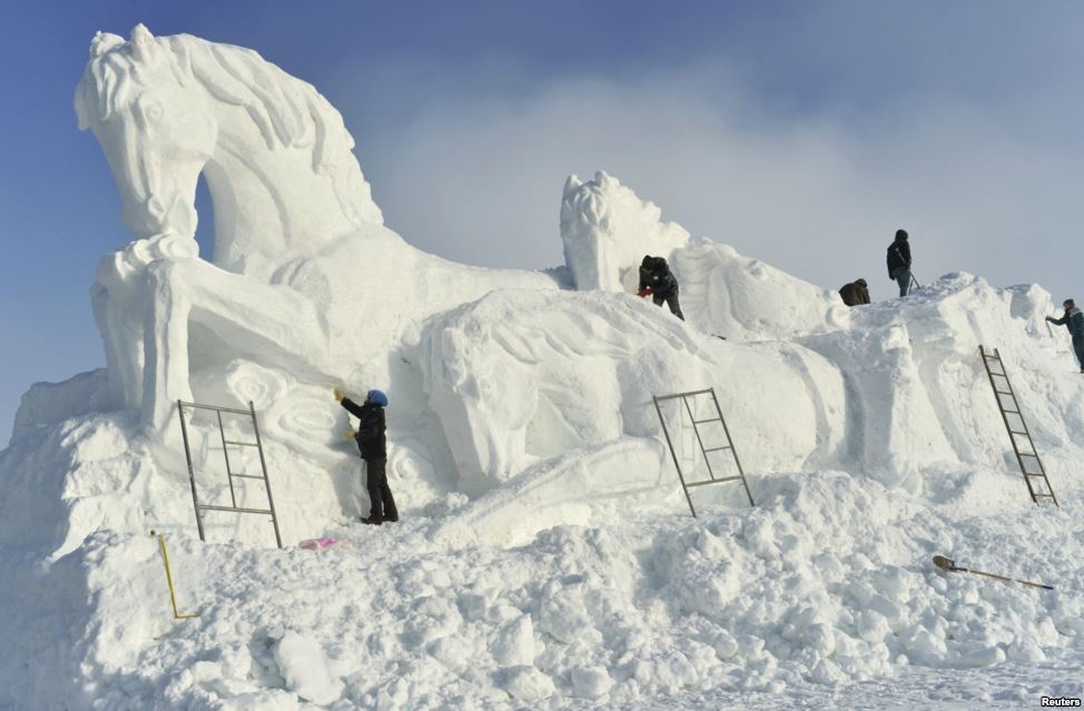Các công nhân thực hiện công trình điêu khắc trên băng hình những con ngựa khổng lồ trước lễ hội băng và tuyết ở Tân Cương miền viễn tây Trung Quốc.