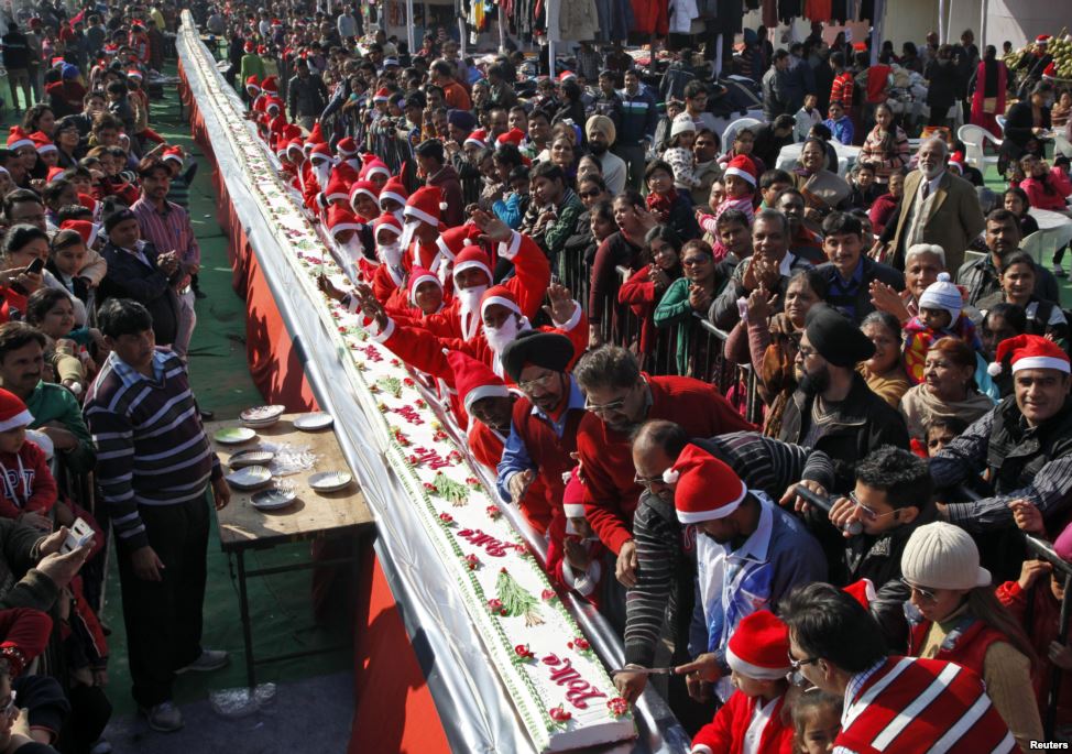 Một người đàn ông chuẩn bị cắt chiếc bánh dài 61 mét trong khi trẻ em reo mừng trong dịp lễ Giáng Sinh ở thành phố Chandigarh miền bắc Ấn Độ.